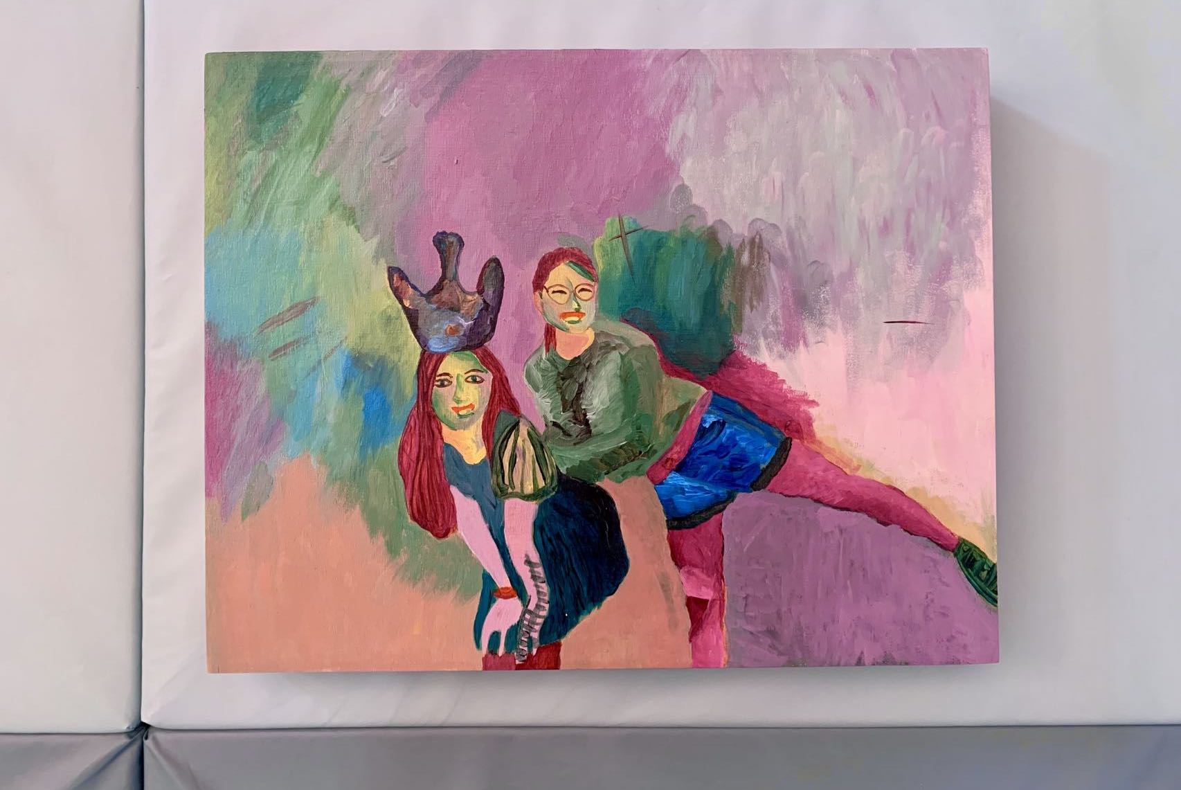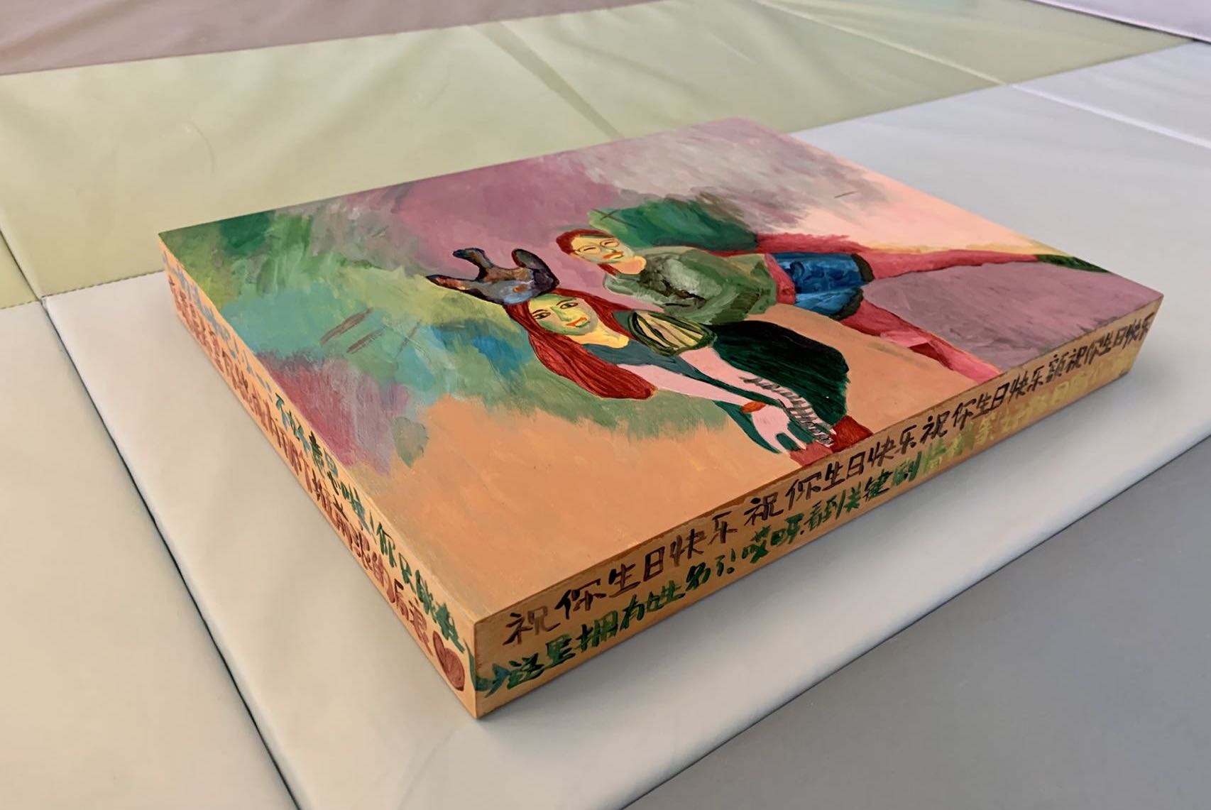 A birthday gift to my childhood friend Cindy Lin. A painting resembles the color palette of Henri Matisse's Woman With A Hat, to express my respect to her boldness in her career path. The gift message is wrapped around the frame, which the viewer has to read by rotating the painting, challenging traditional ways of appreciating paintings. The painting process has been streamed on Twitch. The whole process was edited to a video clip and later sent to Cindy Lin, in which I mumbled about the intention of my choices and the TV show I was watching. I'm always in deep interest exploring what should be a part of an artwork. The remaining colors? The tools I used? Sounds I heard? TV showed I watched? Do all of them which affect how the painting ends up to be should be a part of the artwork?